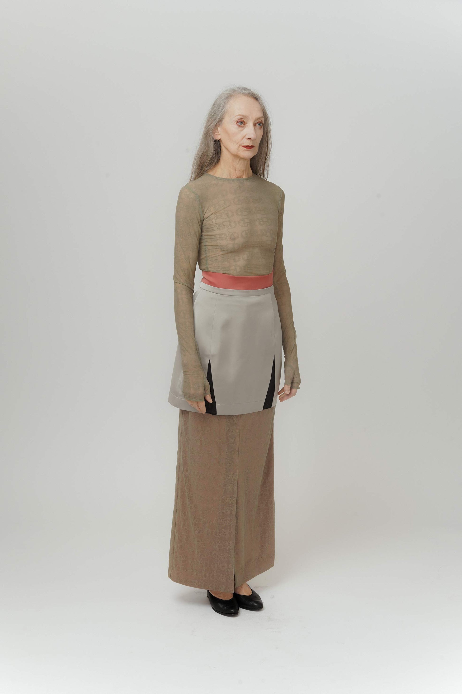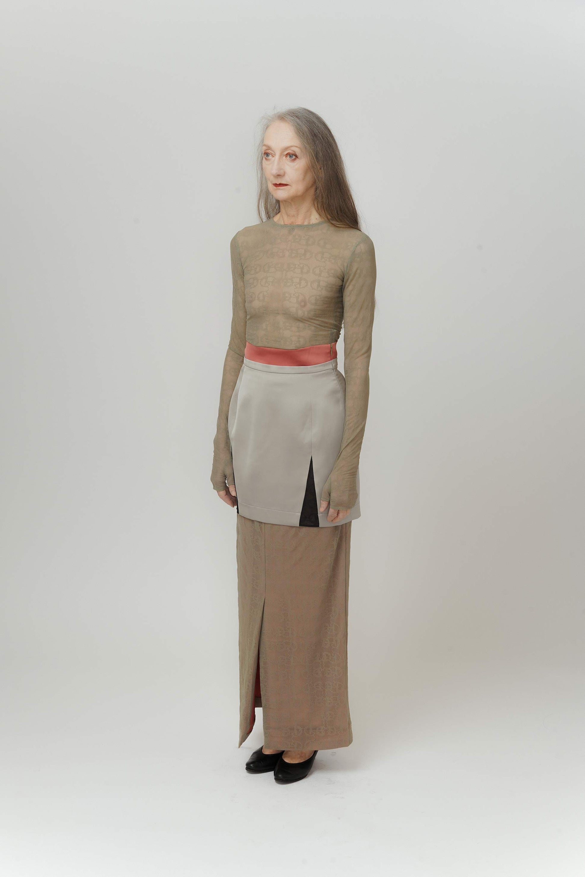 A high waisted skirt with a glossy red waistline to emphasise the waist position in comparison to the pale green mermaid lace underneath. Black lace is inserted at the hem for to add dimension and elasticity.