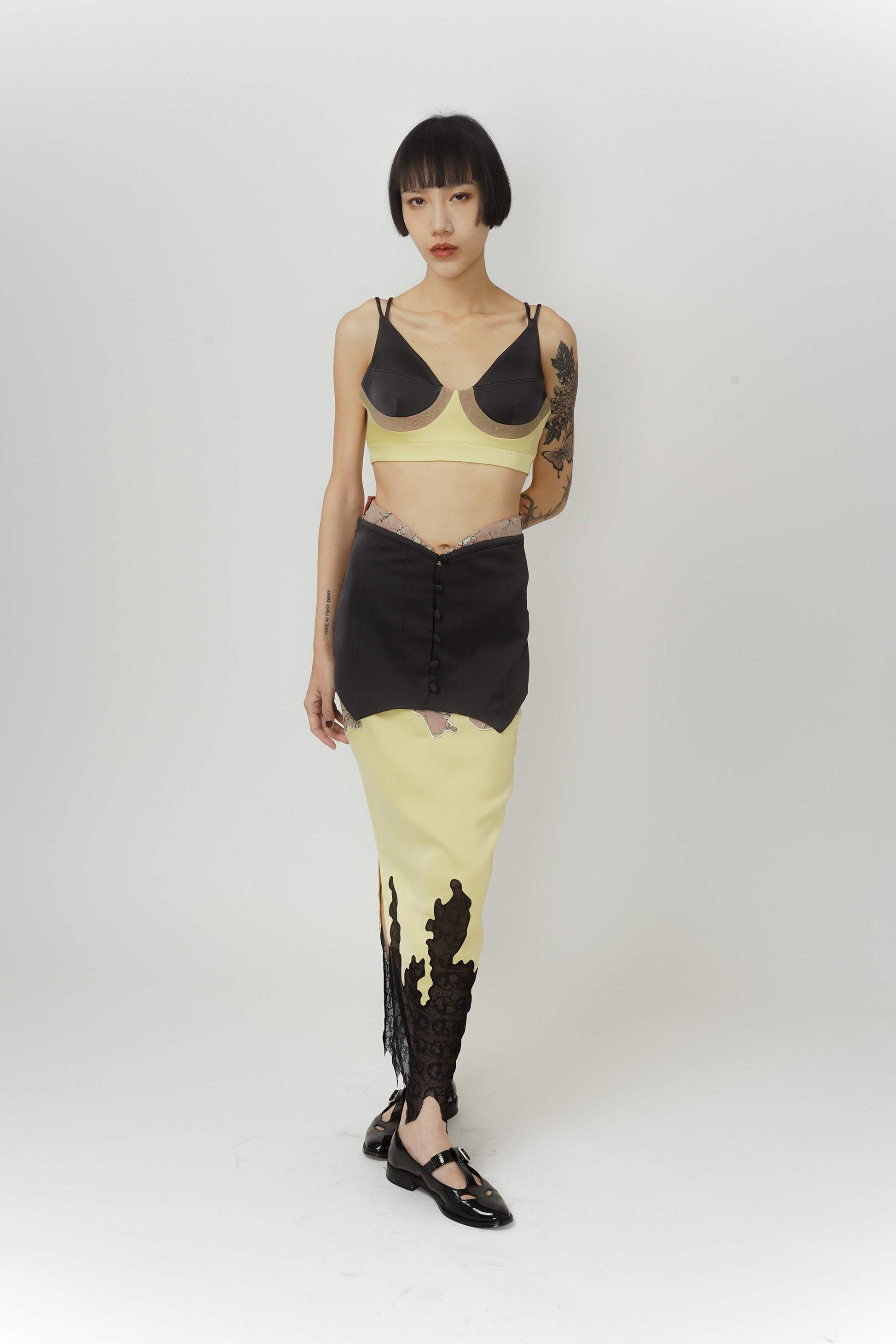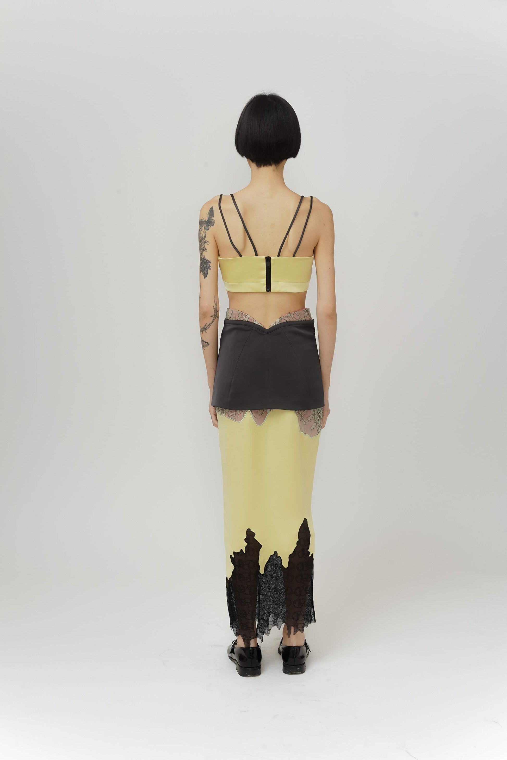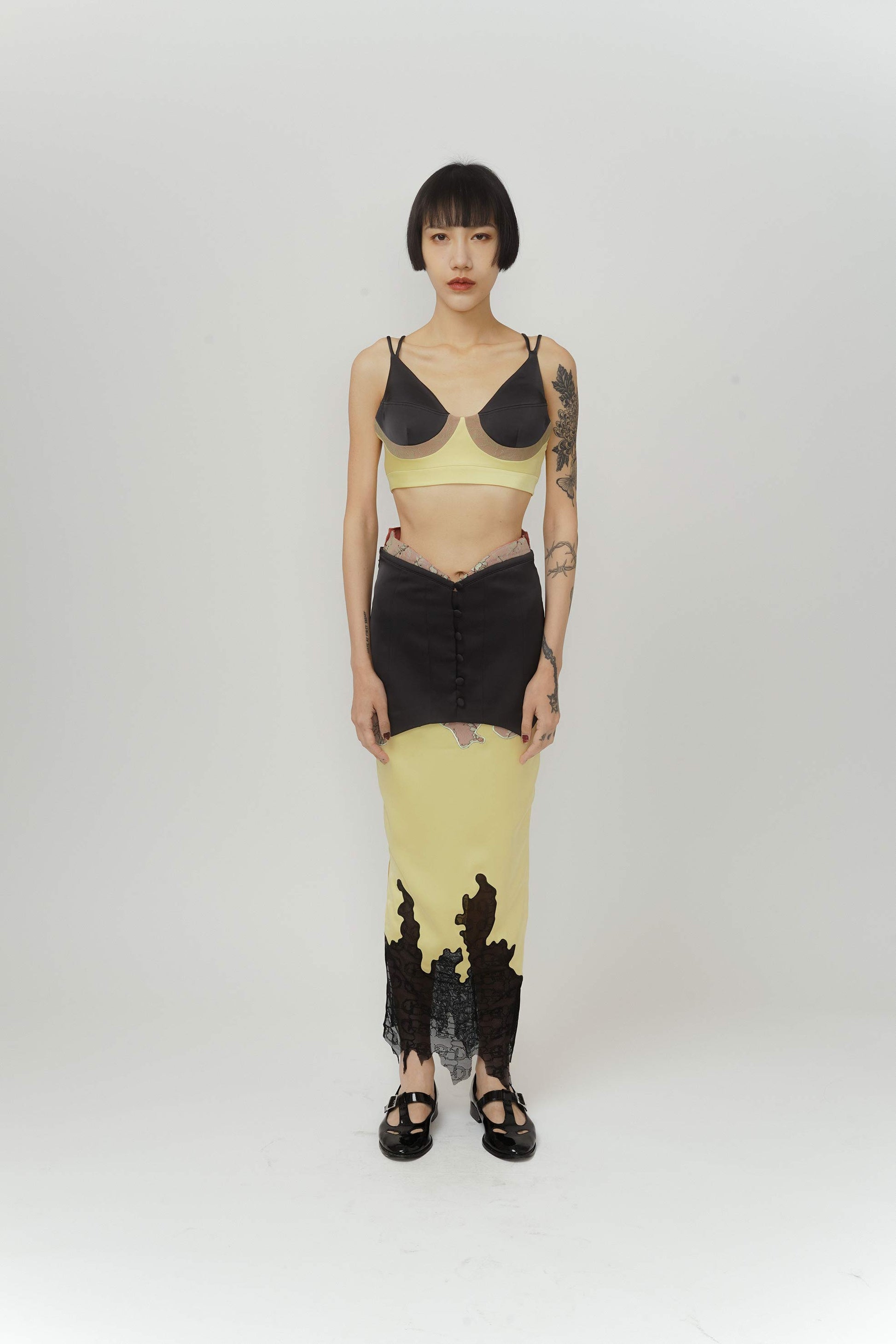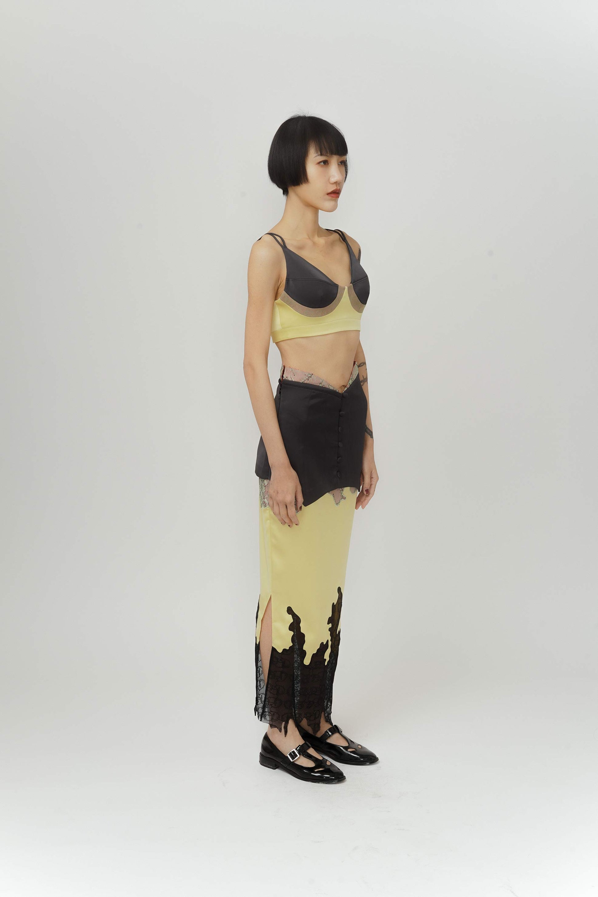 Two layered maxi skirt, a black layer surrounding the waist to accentuate and make it visually smaller through the use of the ‘V’ line shape at the top. Complemented with satin micro-elastic fabric which runs to the bottom of the piece, making it comfortable for the consumer to walk in.