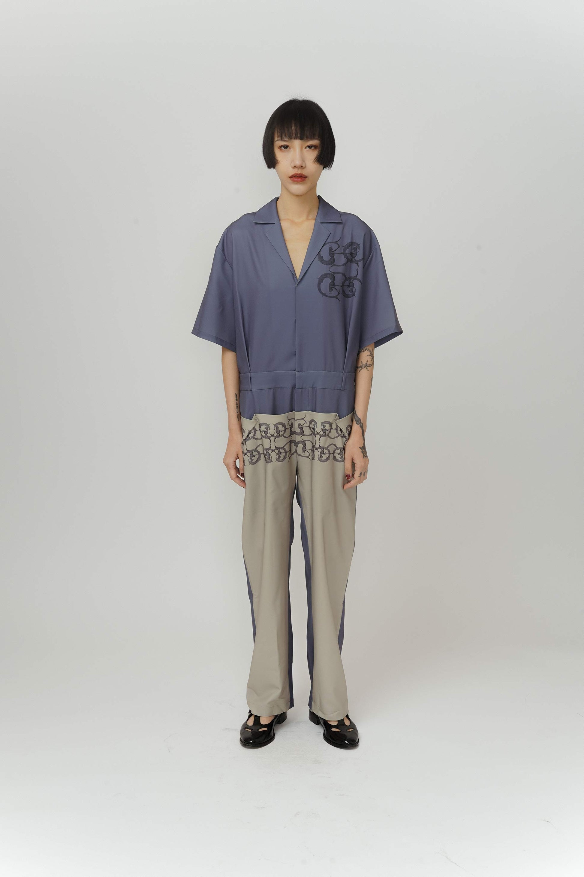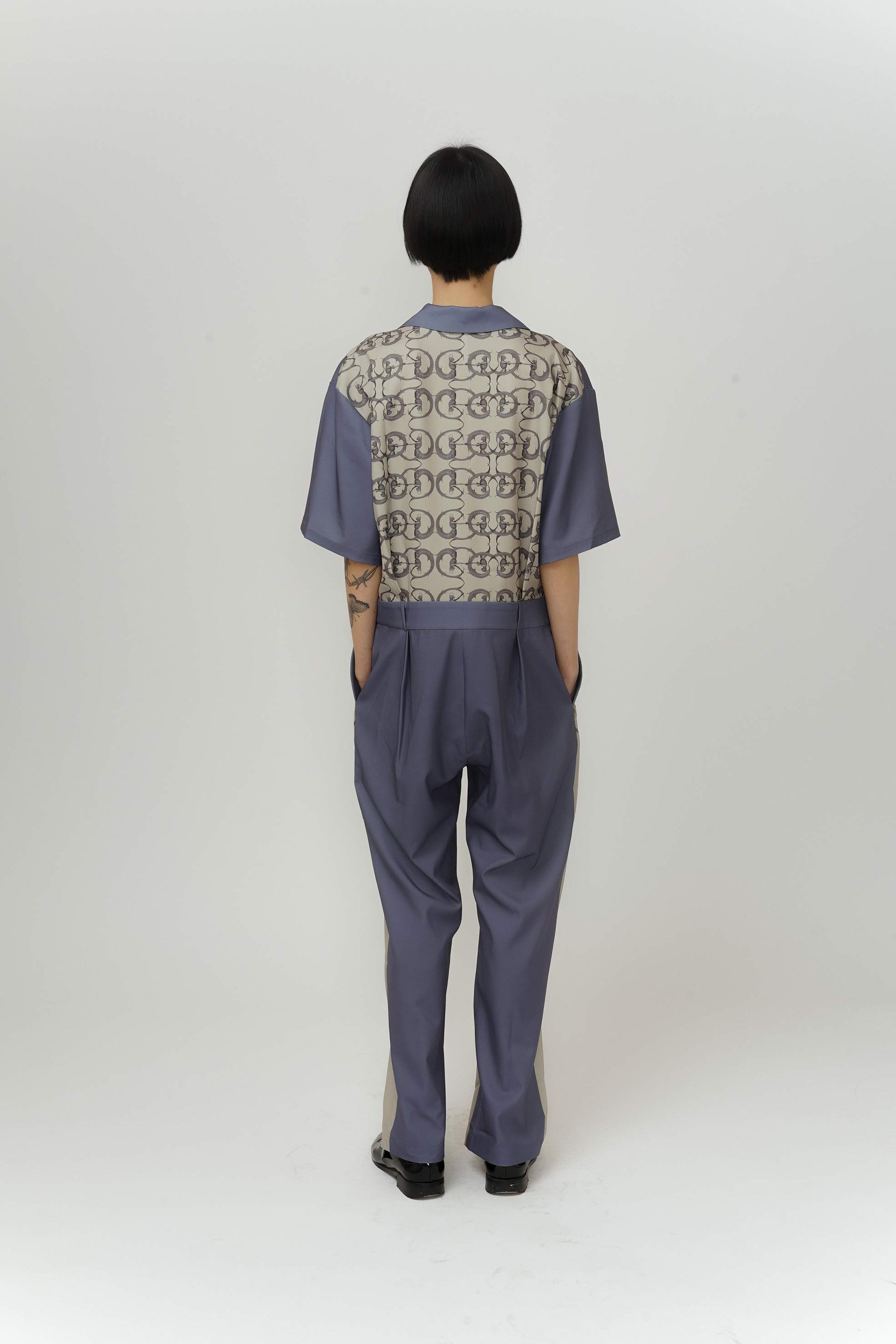 This jumpsuit is printed with our signature mermaid patterns. With a casual open collar allows you to have dropped shoulder sleeves. The front pocket is hidden inside a button.