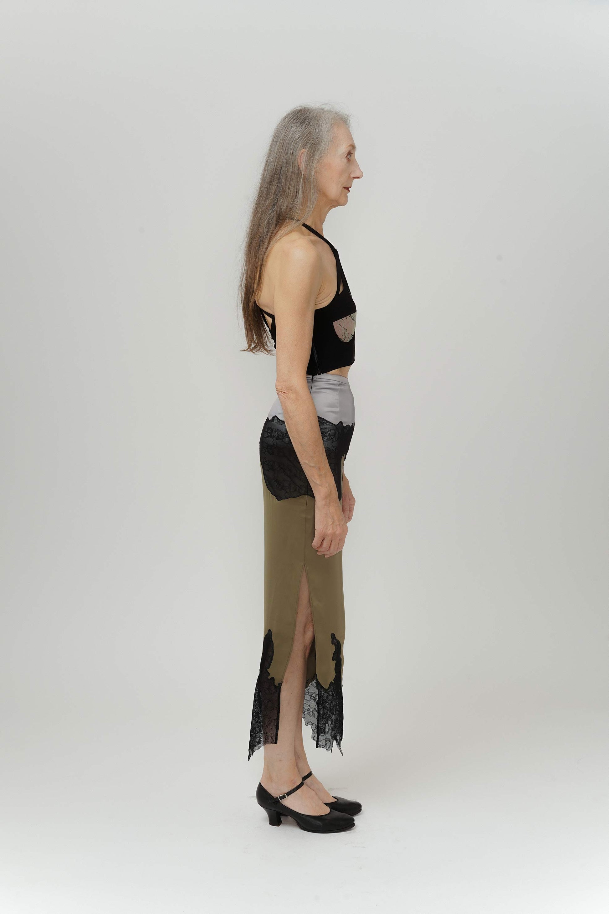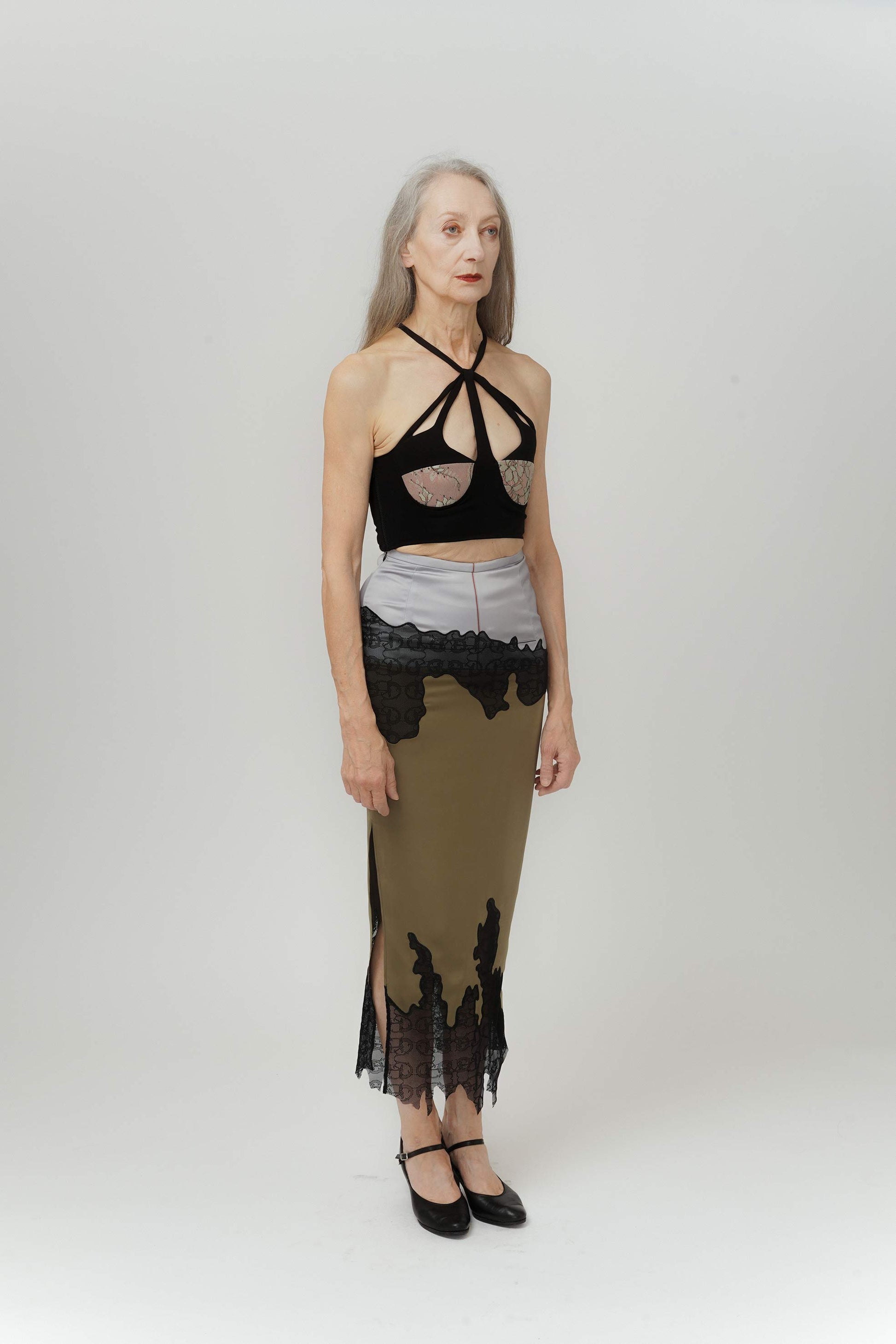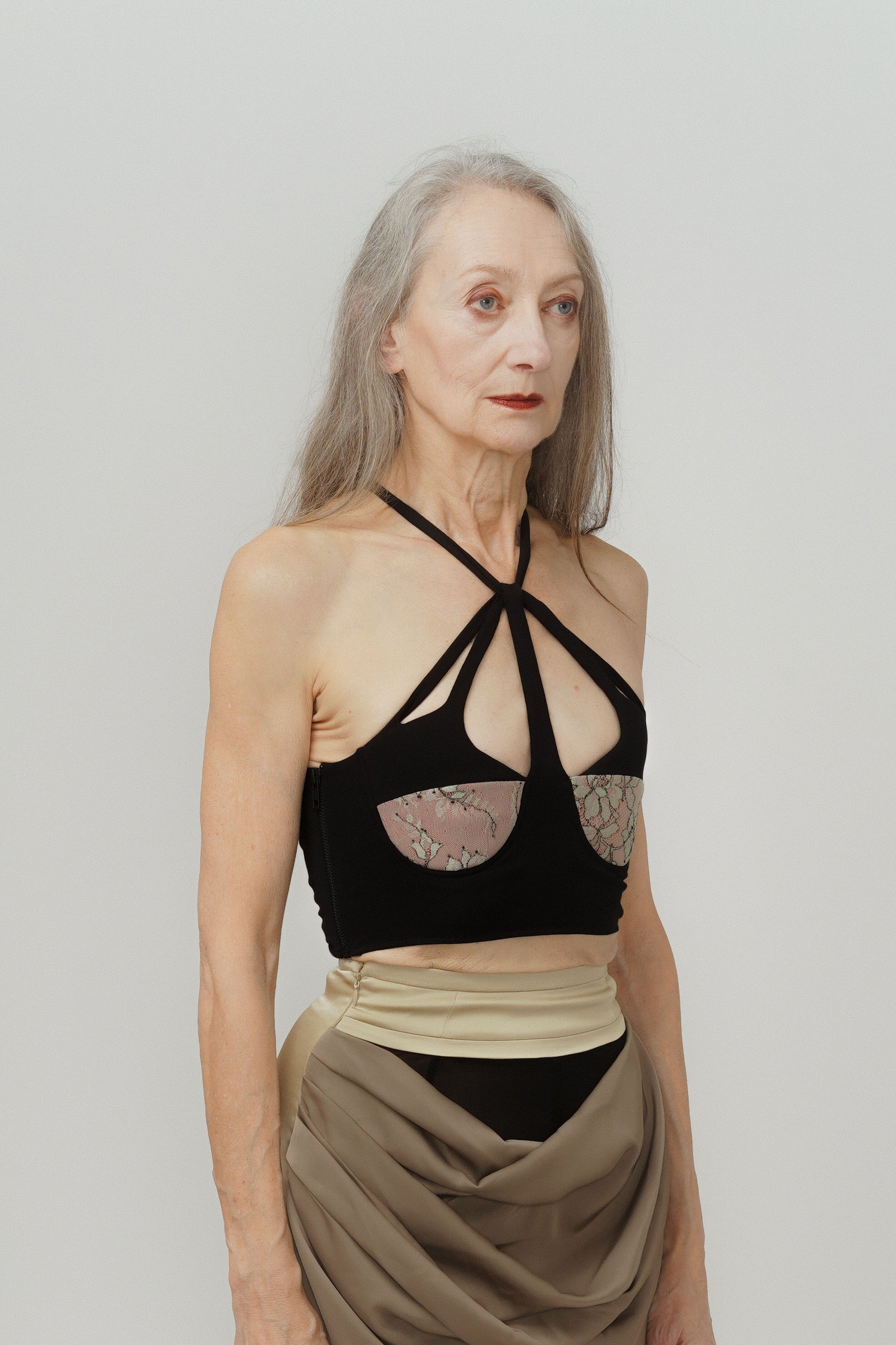 The top is designed with a semi-circle across the chest making the chest look broader with thin mesh incorporated across the full body stretched fabric which includes a zipper on the side.