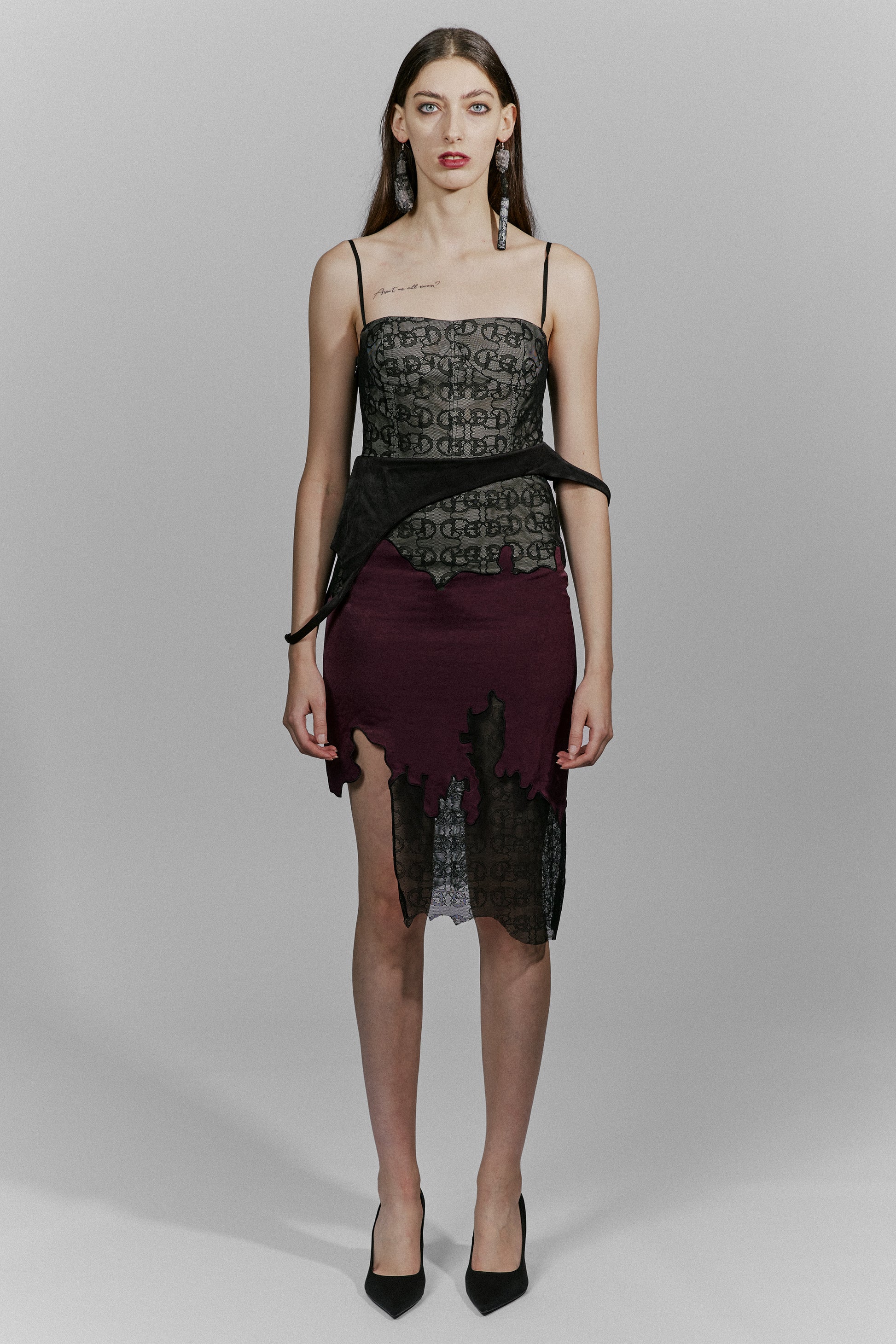 The elegant black demi-side suspenders skillfully emulate the act of disrobing, epitomizing a woman's bold approach to attire. The skirt, adorned with two pieces of lace in contrasting colors, features a tastefully truncated side zipper.