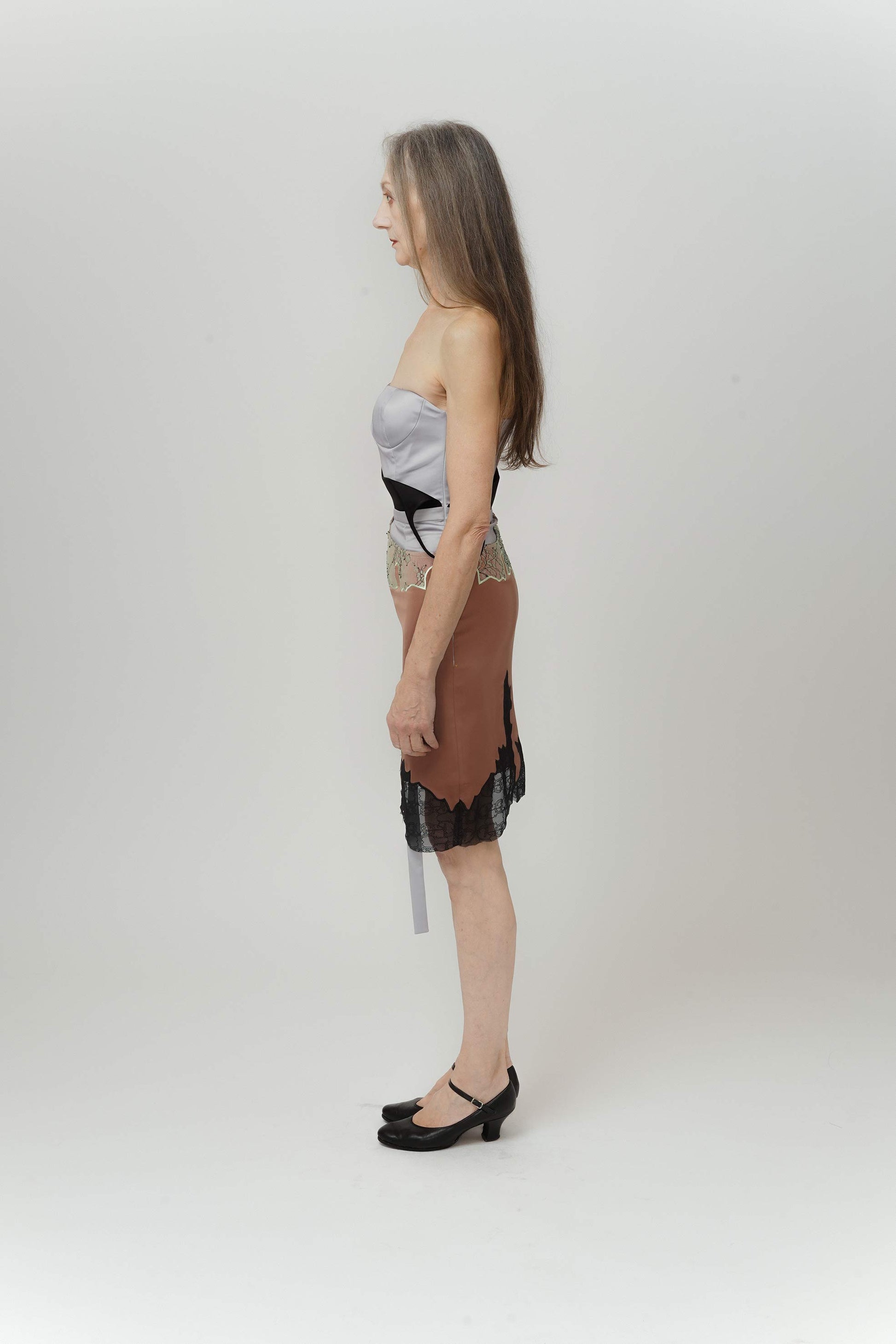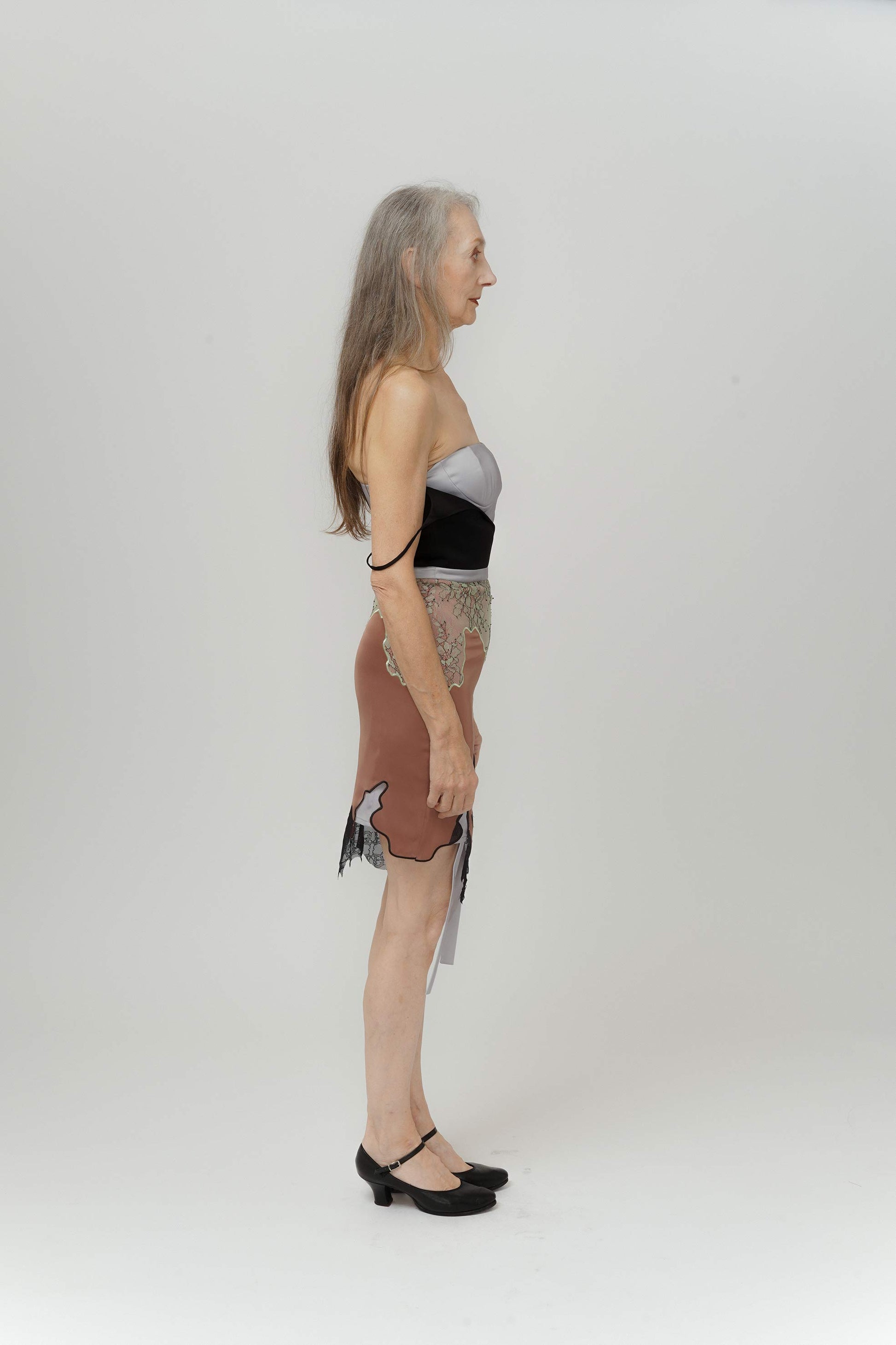 The elegant black demi-side suspenders skillfully emulate the act of disrobing, epitomizing a woman's bold approach to attire. The skirt, adorned with two pieces of lace in contrasting colors, features a tastefully truncated side zipper.