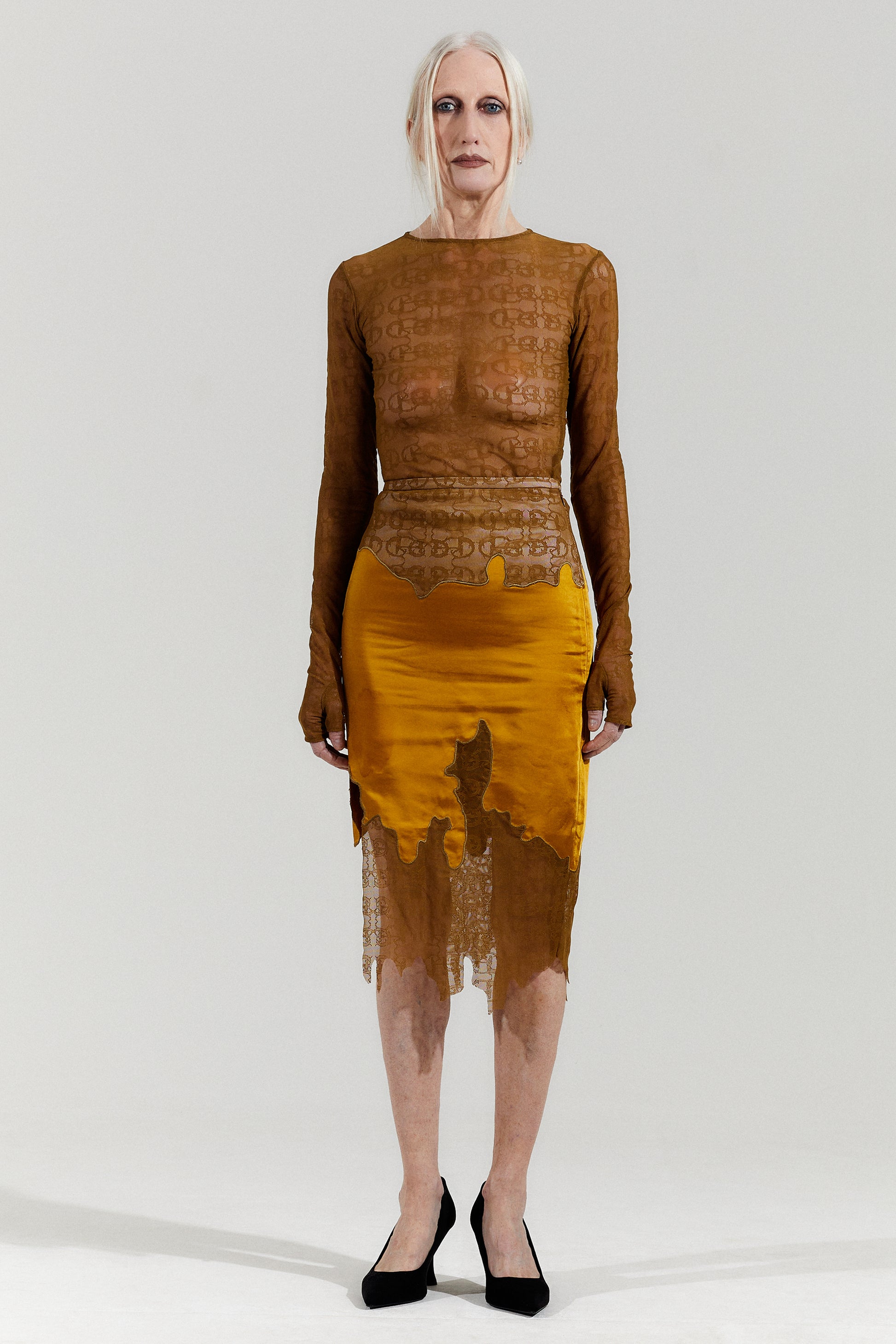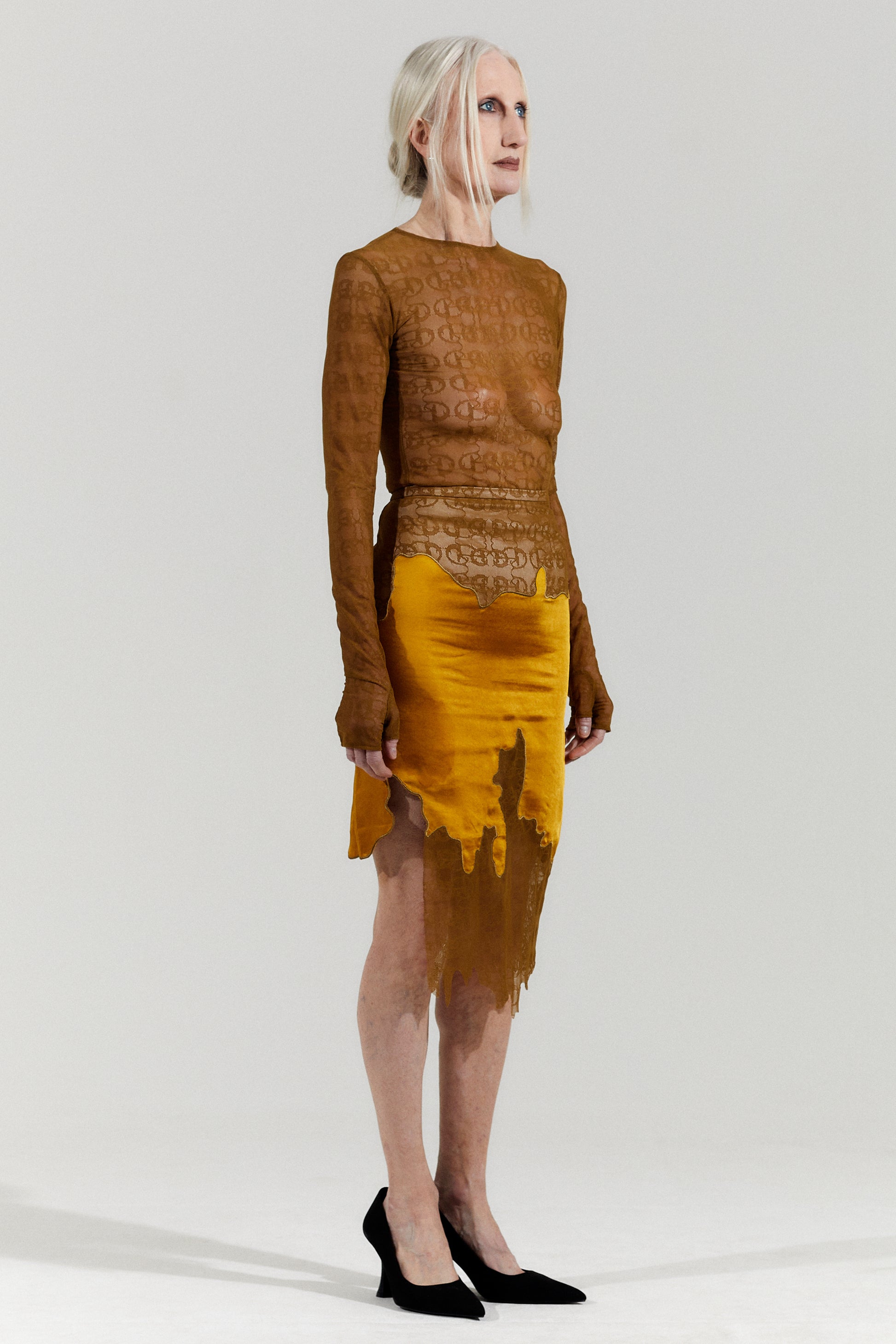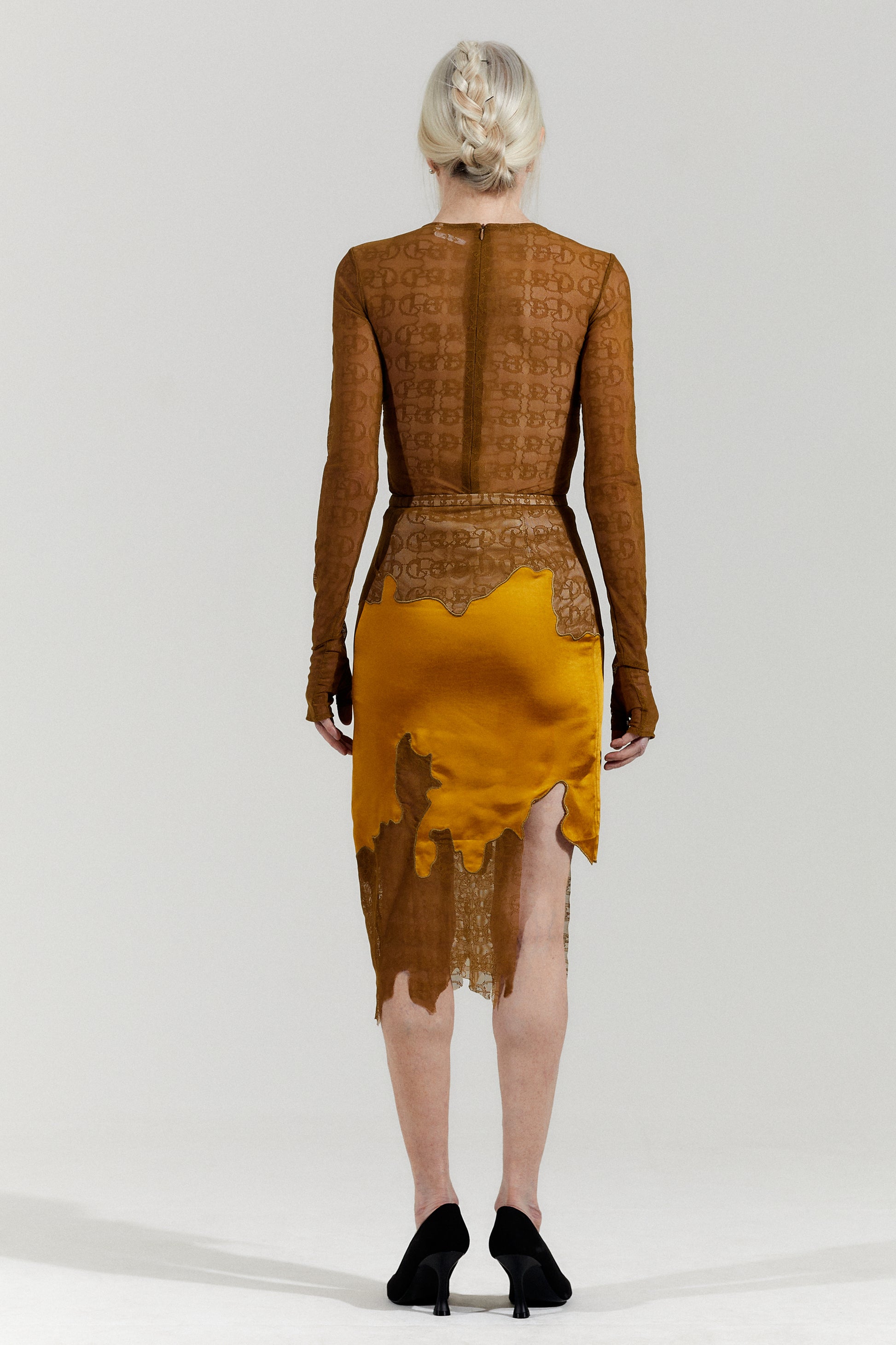 Soft silky fabric skirt, with a ginger yellow mysterious streamlined lace stitching around the entire body, creating an enchantress feeling throughout. The high slit on the side is sexy, empowering the woman who walks in it.