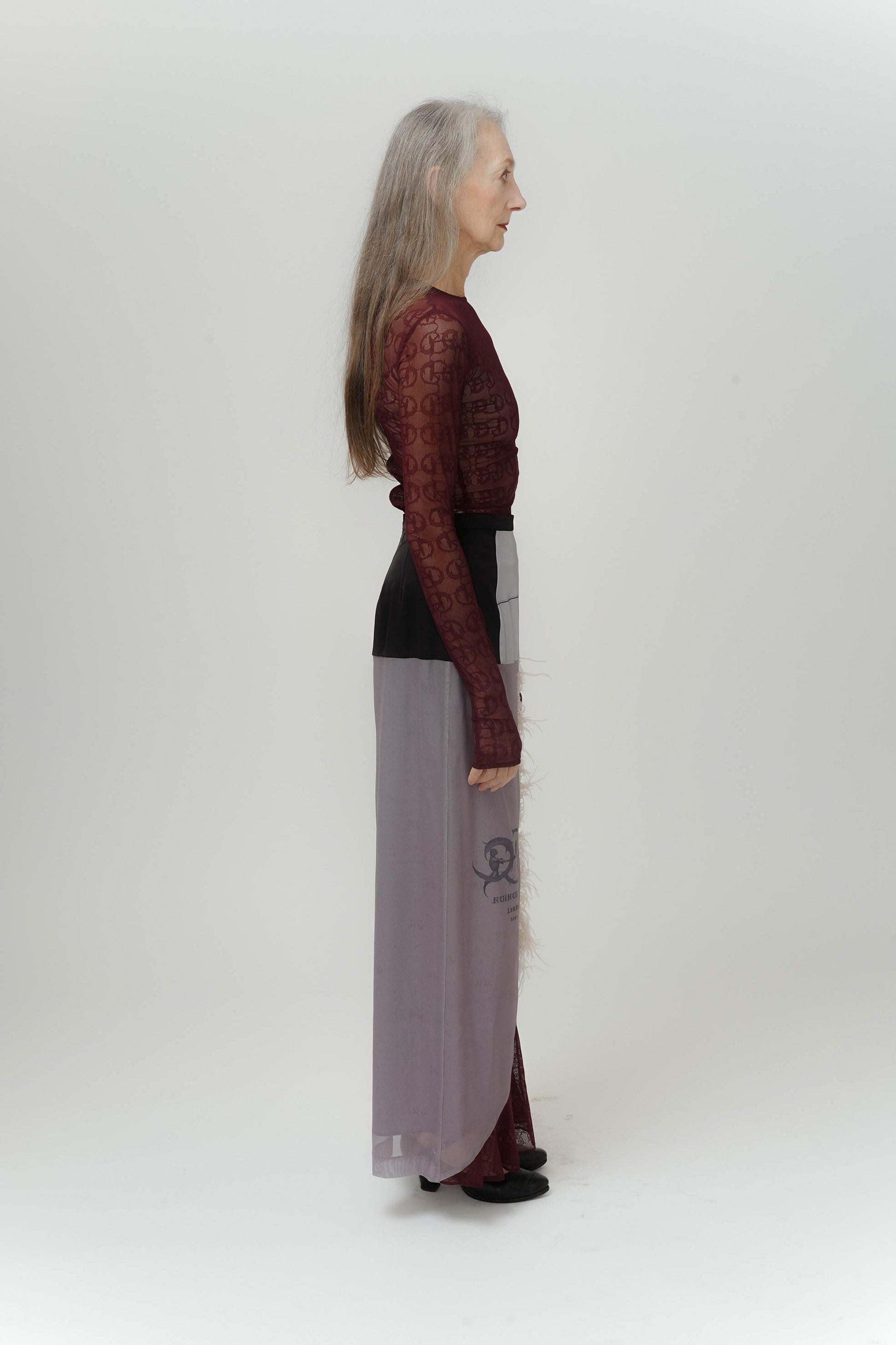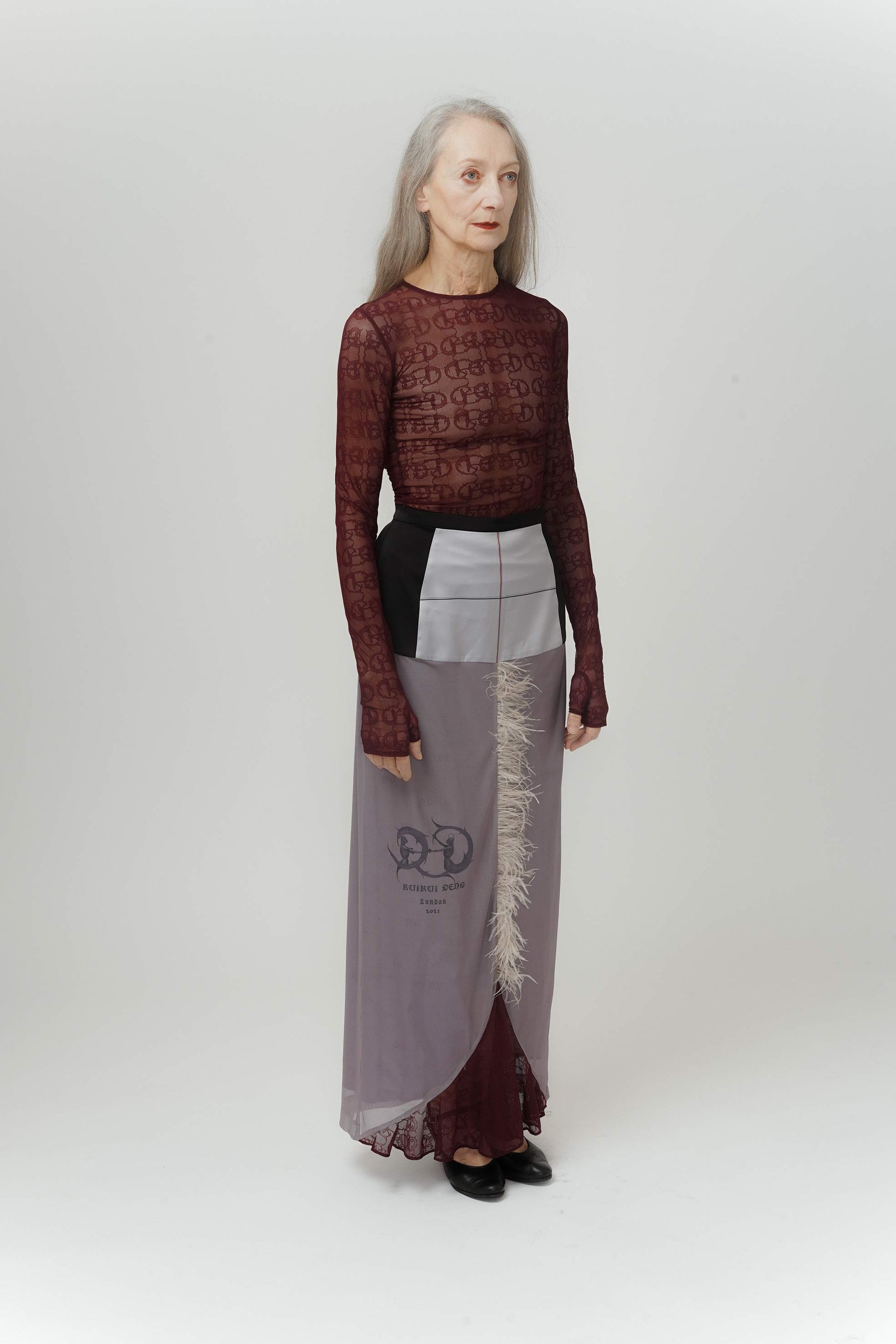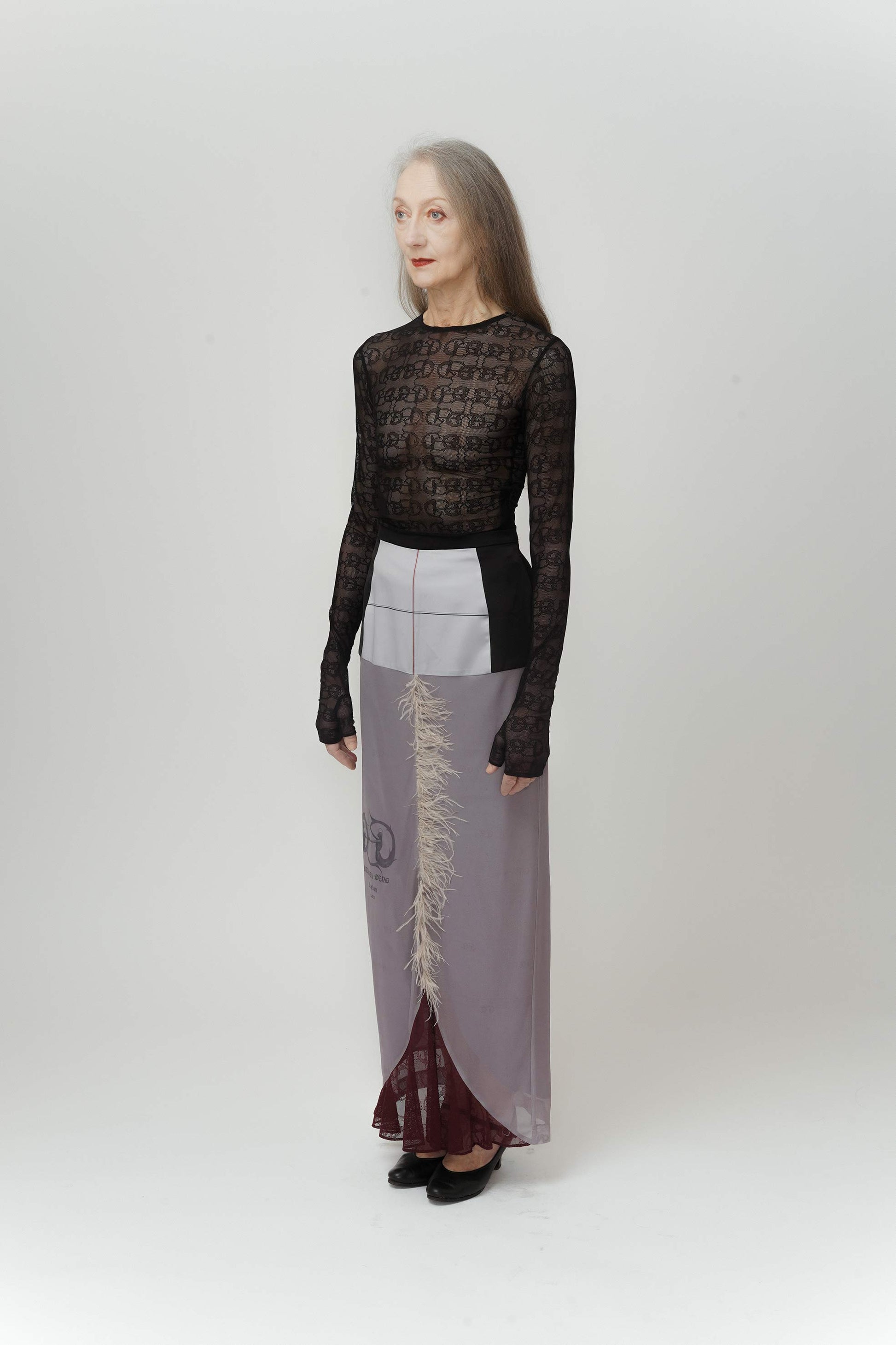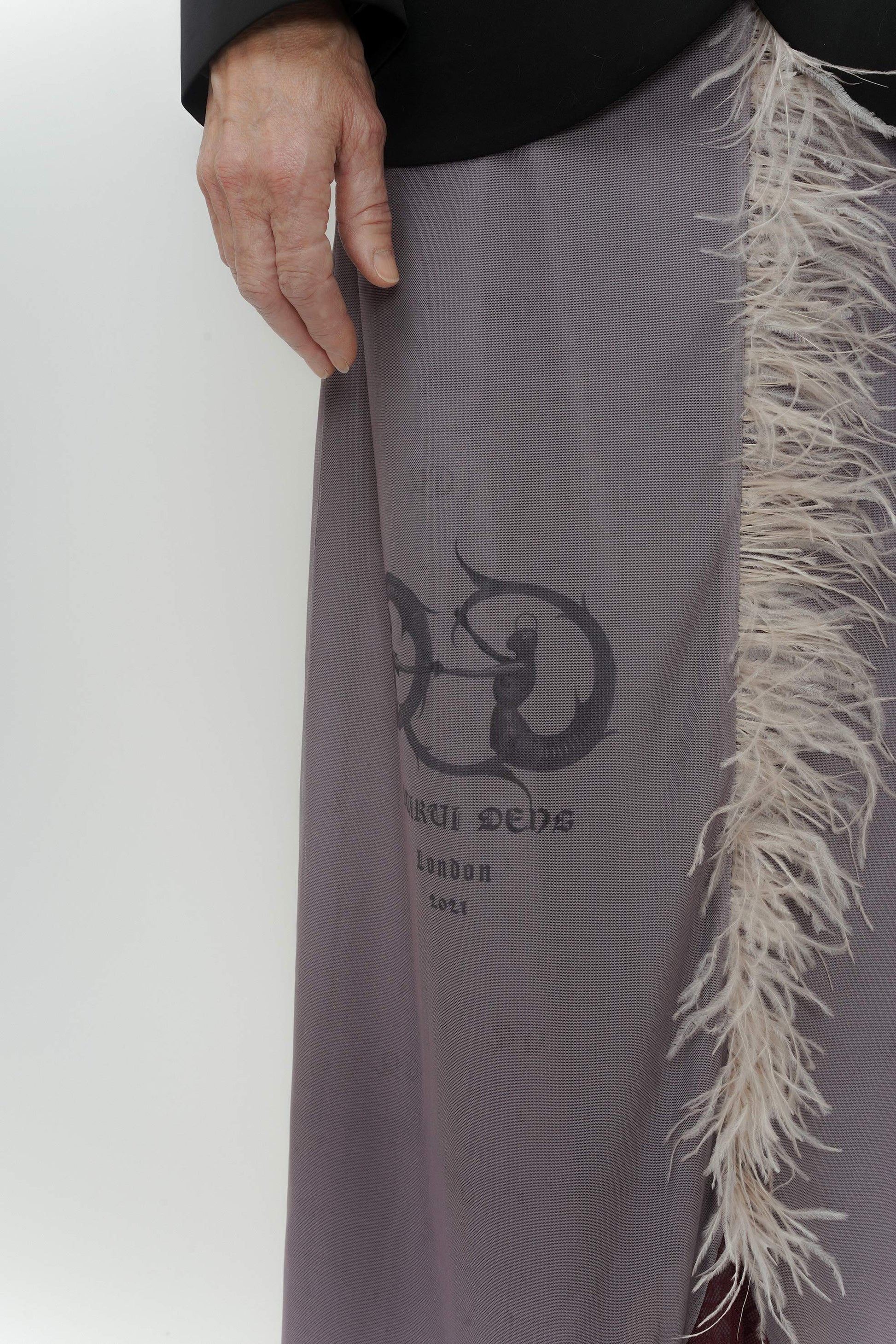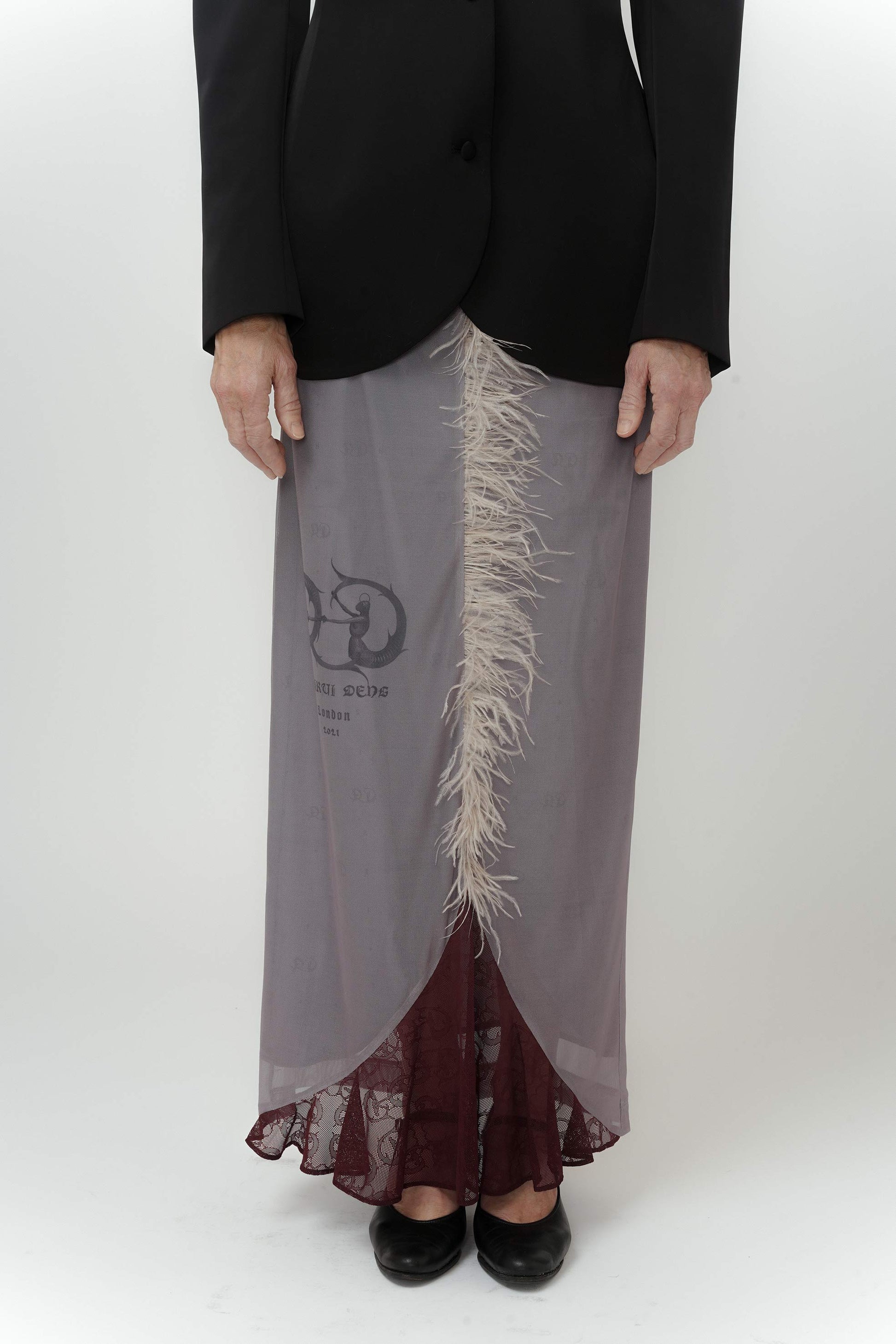 Beautifully made skirt with a lot of detail on the front including vegan feathers down the middle as well as a fan shape towards the bottom, allowing the lace to be seen. The top bit of the skirt has the horizontal and vertical lines across in additional to the black panel - slimming the figure of the consumer.