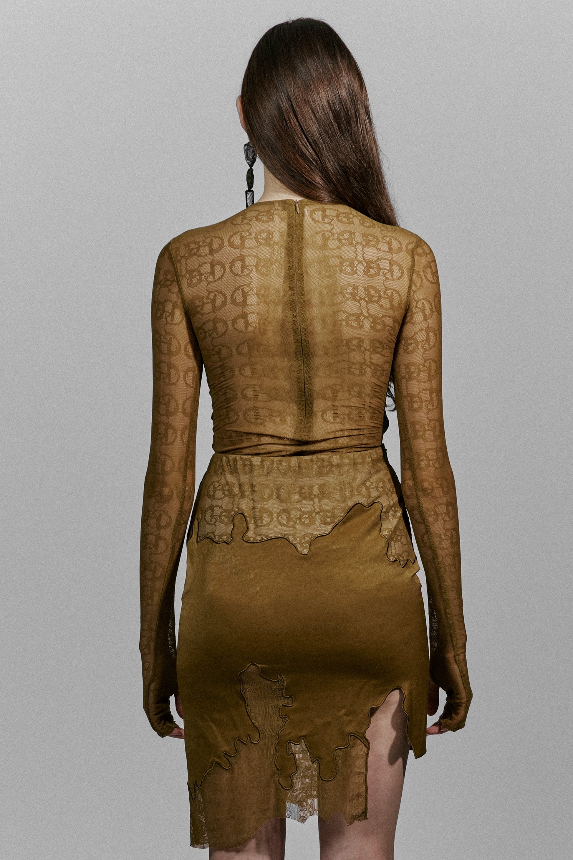 A lace top with signature mermaid logo printing accompanied by zips on the back and sides. There is a silhouette along the front of the top with thumb holes on the sleeves making it more casual chic.